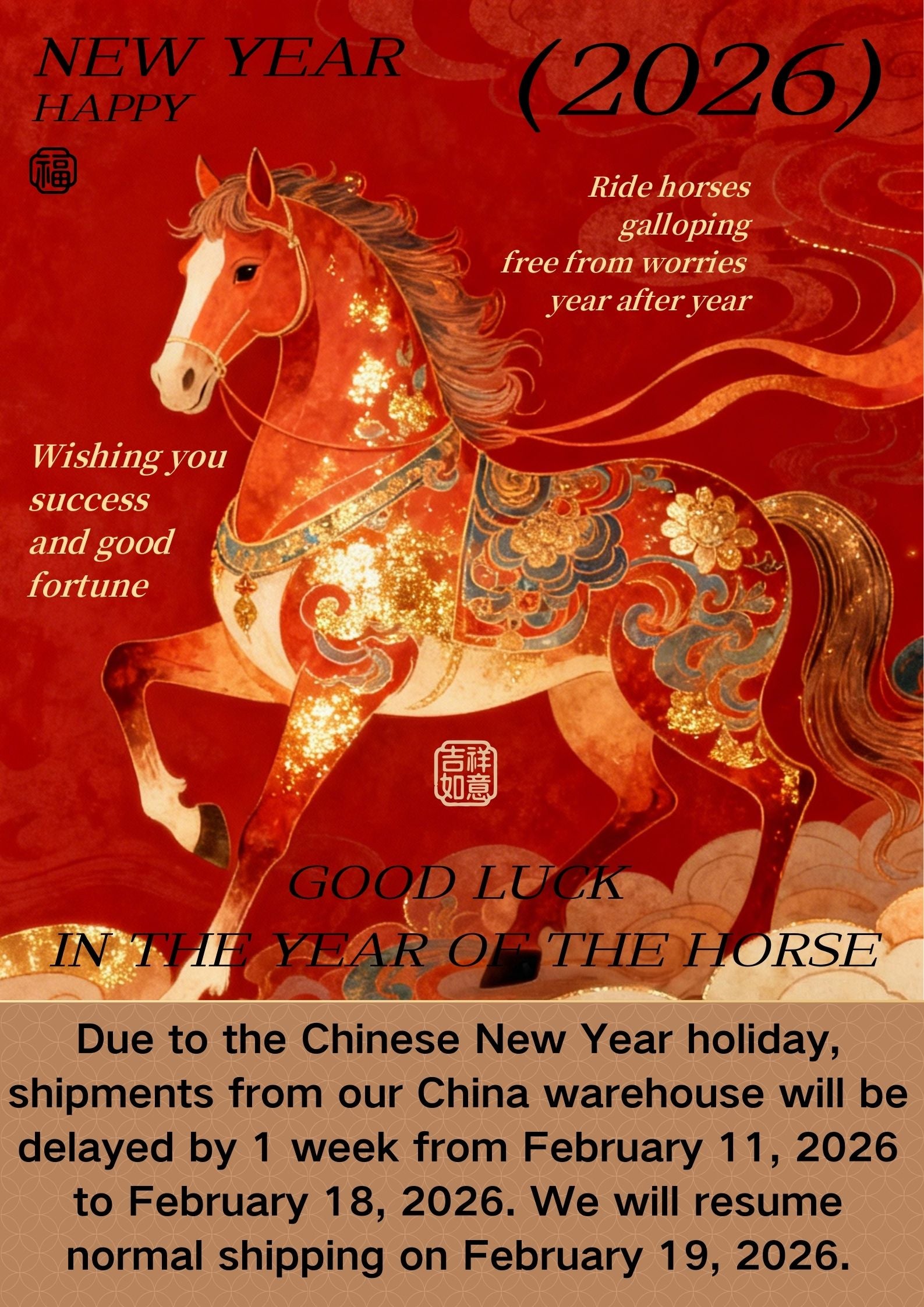 - Due to the Chinese New Year holiday, shipments from our China warehouse will be delayed by one week from 2/11 to 2/18. We will resume normal shipping on 2/19